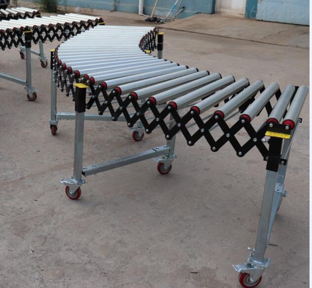 无动力伸缩滚筒输送机脚轮装置移动方便、升降装置可灵活调节单元或整体高度,也可调节成倾斜面。